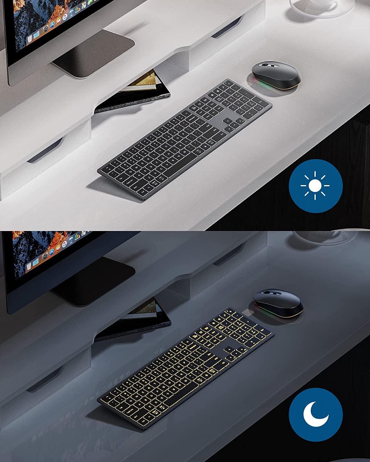 7 Colors Backlit Keyboard & Mouse – Light up your digital life with the illuminated keyboard and mouse! The wireless keyboard features uniform 7-color backlights that can be adjusted from low, medium, high, and off, plus the laser-etched characters which are clear in any lighting, the backlit keyboard is easy to set the perfect light to cater to your environment and create a livelier working atmosphere. And the RGB illuminated mouse also perfectly complements the lighted keyboard's aesthetic