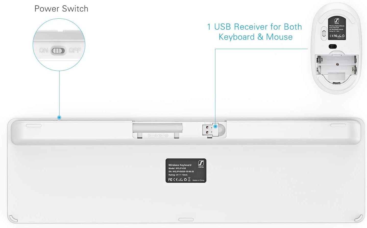 1 USB Plug for Both Keyboard and Mouse — This keyboard & mouse combo using only 1 USB plug, which is inserted on the back of the Mouse. Stable 2.4GHz wireless provides a powerful, reliable connection up to 33ft without any lags